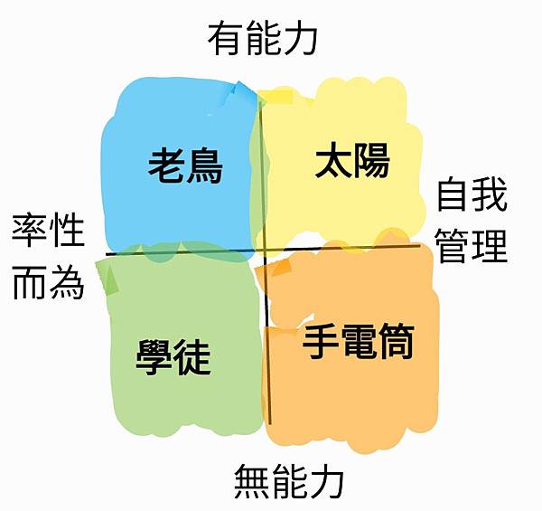 新人養成強調因才施教,不同關鍵時刻提供正確的方法,從菜鳥學徒開始,需要導正良好的工作態度與習慣,當進入軌道後,新人就像手電筒一樣,需要隨時給對方的鼓勵與動力;當能力足夠就進入老鳥的階段,需要提供發揮的空間,多參與團隊的運作,直到各方面能力與態度都足夠成熟,就給予足夠的授權,引導其成為太陽型人才。