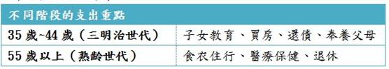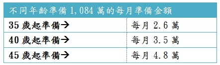 如果35歲起準備,每月要2.6萬,但是35歲到44歲是目前我們所稱的「三明治世代」,上有父母要奉養,下有子女要照顧,這階段的支出重點是子女教育金、買房、還債、奉養父母等,必須要等待到44歲以後,才會開始有心力想到退休或晚年照護的問題。
