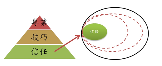 很多時候我們會把時間花在專業及技巧,但是隨著培訓時間增加,業務同儕間的專業能力及技巧大多不會差異太大。因此,最終會拉大距離的是你是否可以持續擴大客戶對你的信任,如下圖所示。而複訪的目的不僅在了解客戶的狀況,更多是在培養信任感,並續將客戶對我們的信任程度持續擴大。